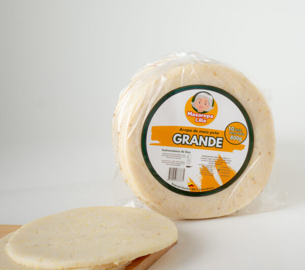 Paquete (10 und/800g) Deliciosa Arepa tradicional para acompañar disponible en maíz blanco y amarillo.